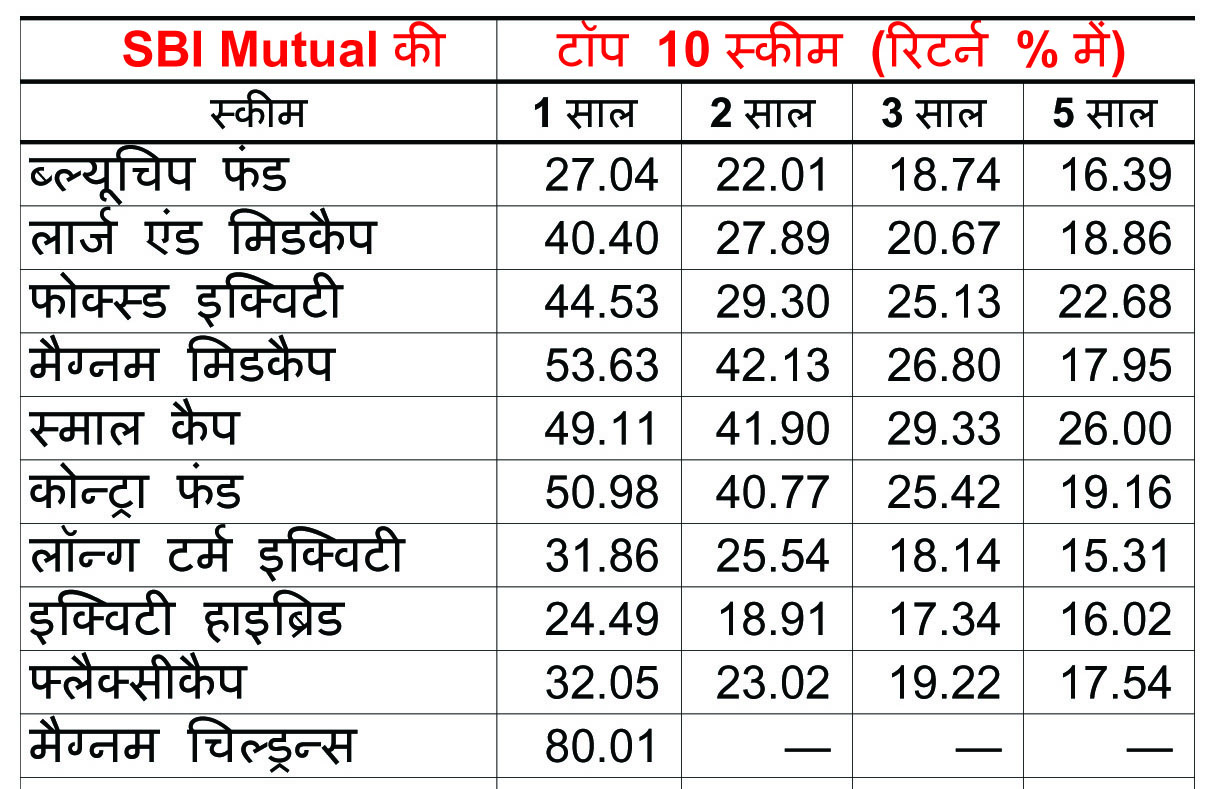 एसबीआई म्युचुअल फंड की सबसे ज्यादा फायदा देने वाली 10 इक्विटी स्कीमों की बात करें तो इनमें निवेशकों को पिछले एक साल में 24% से लेकर 80% तक का बढ़िया रिटर्न प्राप्त हुआ है। सबसे अधिक 80% का रिटर्न इसकी नई स्कीम एसबीआई मैग्नम चिल्ड्रन्स बेनिफिट फंड (SBI Magnum Children’s Benefit Fund) ने दिया है। 31 दिसंबर 2021 तक के आंकड़ों के मुताबिक, विगत दो वर्षों में एसबीआई की टॉप 10 स्कीमों ने 19% से लेकर 42% तक का प्रतिफल दिया है। लॉन्ग टर्म (Long Term) में भी अच्छा रिटर्न मिल रहा है। विगत 5 वर्षों में इन 10 स्कीमों में निवेशकों को 15% से लेकर 26% तक की कमाई हुई है। यानी निवेशक मालामाल हो रहे हैं।