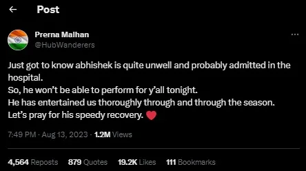 ये खबर खुद अभिषेक मल्हान की बहन प्रेरणा मल्हान ने अपने ट्विटर हैंडल से ट्वीट के जरिए दी है। इतना ही नहीं उन्होंने अपने ट्वीट में यह भी बताया है कि अभिषेक मल्हान शो के फिनाले नाईट में परफॉर्म नहीं कर पाएंगे। अभिषेक मल्हान की बहन प्रेरणा मल्हान ने अपने ट्वीट में लिखा, ‘बस अभी पता चला कि अभिषेक की तबियत बिगड़ गई है और शायद वो हॉस्पिटल में एडमिट हैं। इसलिए वो आज रात आप सभी के लिए फिनाले में परफॉर्म नहीं कर पाएंगे। उन्होंने पूरे सीजन में हमारा भरपूर एंटरटेनमेंट किया है। आइए उनके जल्दी ठीक होने के लिए प्रार्थना करें।”
