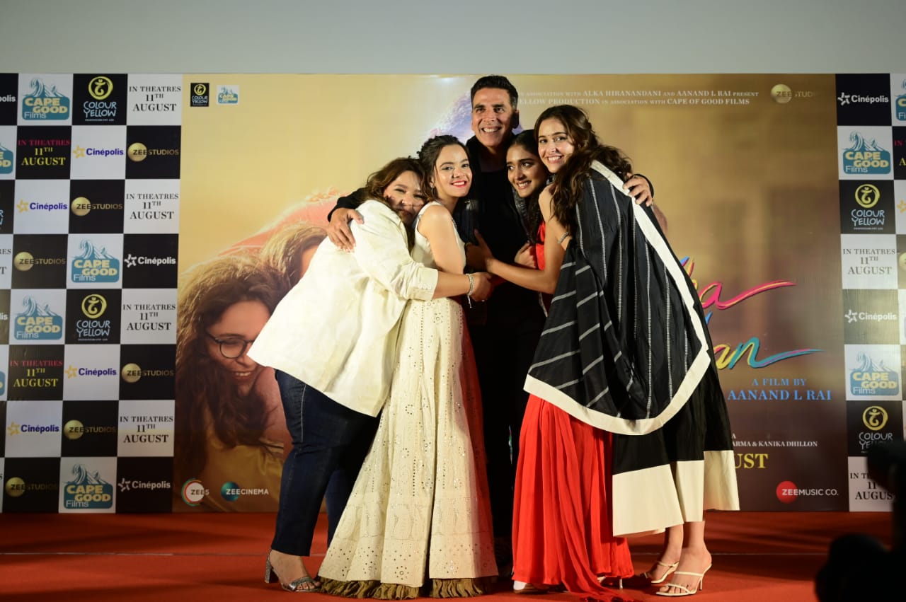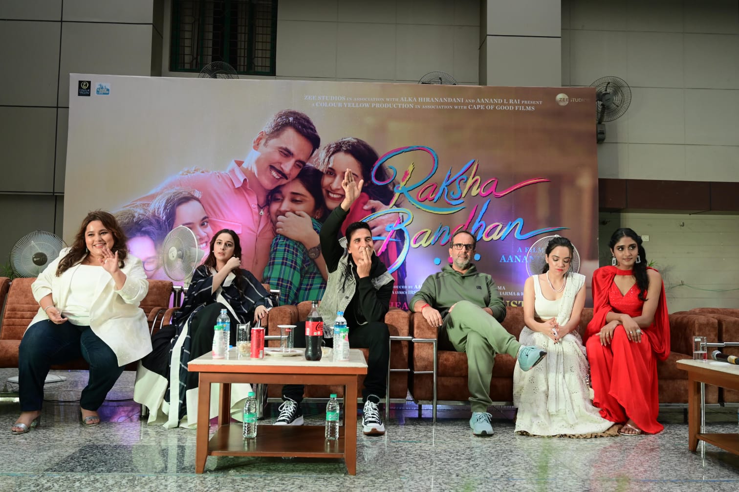 ‘रक्षा बंधन’ प्रमोशन के दौरान ऑन स्क्रीन बहनों के साथ अक्षय कुमार कुछ इस अंदाज में आए नजर।