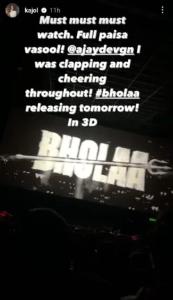 फिल्म को देखने के बाद एक्ट्रेस ने अपने सोशल मीडिया के जरिए पति अजय देवगन की फिल्म ‘भोला’ का रिव्यु शेयर किया है। काजोल ने अपने इंस्टाग्राम स्टोरी पर बड़े स्क्रीन को शेयर किया है। जिसके स्क्रीन पर फिल्म ‘भोला’ नजर आ रही है। उन्होंने तस्वीर शेयर कर लिखा, “अवश्य देखना चाहिए। पूरा पैसा वसूल। लगातार ताली बजा रही थी और चियरिंग कर रही थी। ‘भोला’ 3डी में भी रिलीज होगी।” उनके इस रिव्यु से साफ पता चलता है कि काजोल ने फिल्म ‘भोला’ को खूब एन्जॉय किया है।