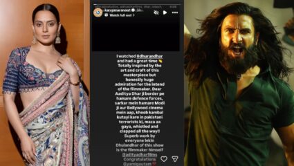 फिल्म की इस जबरदस्त सफलता के बीच अब अभिनेत्री और लोकसभा सांसद कंगना रनौत ने भी ‘धुरंधर’ देखी है। फिल्म देखने के बाद कंगना खुद को तारीफ करने से रोक नहीं पाईं और उन्होंने सोशल मीडिया पर निर्देशक आदित्य धर की जमकर सराहना की। कंगना ने अपने इंस्टाग्राम पोस्ट के जरिए फिल्म को ‘मास्टरपीस’ बताया है।