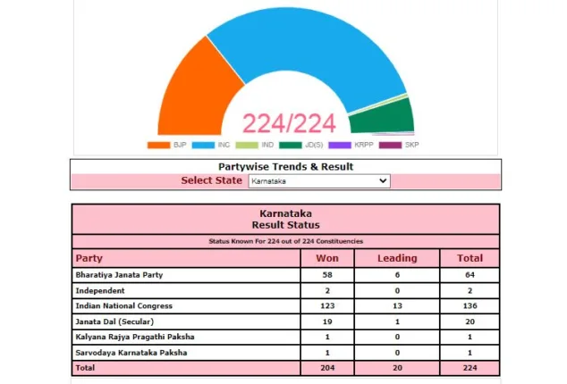 अब तक आए परिणामों के मुताबिक, कांग्रेस 224 सदस्यीय विधानसभा में 123 सीटों पर जीत हासिल कर चुकी है जबकि 14 सीटों पर वह बढ़त बनाए हुए है। बढ़त वाली सीटों को भी वह जीत लेती है तो वह 136 के आंकड़ें तक पहुंच सकती है। वर्ष 1989 के विधानसभा चुनाव के बाद यह कांग्रेस की सबसे बड़ी जीत होगी। भाजपा ने अभी तक 58 सीटों पर जीत दर्ज की है जबकि 6 सीटों पर उसके उम्मीदवार आगे हैं। इस प्रकार वह 64 सीटों पर सिमटती दिख रही है। जनता दल (सेक्युलर) 20 सीटें जीतने की ओर अग्रसर है।