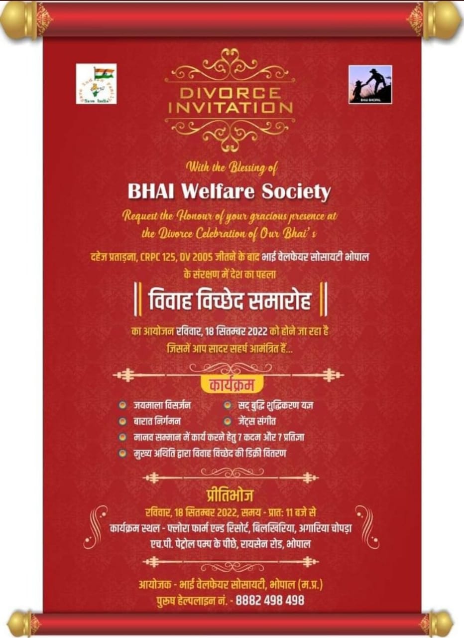 दरअसल, भोपाल (Bhopal की भाई वेलफेयर सोसायटी में 18 सितंबर को तलाक उत्सव का आयोजन किया जा रहा है। यह उत्सव 5 से 10 साल की लंबी लड़ाई के बाद मिले तलाक की खुशी को सेलिब्रेट करने के लिए है। जिसके लिए बाकायदा शादी के कार्ड जैसे ही डिवोर्स कार्ड छपवाकर उसके जरिए ‘विवाह विच्छेद समारोह’ के लिए मेहमानों को बुलाया जा रहा है। जिसमें करीब 200 लोगों को निमंत्रण दिया गया है।