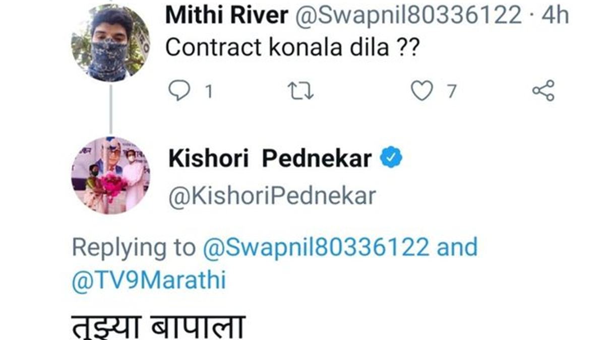 दरअसल घटना के अनुसार किशोरी पेडनेकर ने एक निजी मीडिया चैनल को दिए इंटरव्यू को अपने ट्विटर हैंडल पर भी शेयर किया था। रिपोर्ट्स के मुताबिक इस इंटरव्यू में मुंबई के अंदर एक करोड़ वैक्सीनेशन को लेकर नौ कंपनियों का जिक्र हुआ था, जिनसे BMC फिलहाल वैक्सीन खरीदने की कोशिश कर रही है। इस ट्वीट के नीचे जब एक यूजर ने उनसे पूछा कि किन कंपनियों को कॉन्ट्रैक्ट दिया गया है। तब जवाब में पेडणेकर के टि्वटर हैंडल से मराठी में लिखा गया ‘तुझ्या बापाला’ यानी ‘तुम्हारे बाप को’।