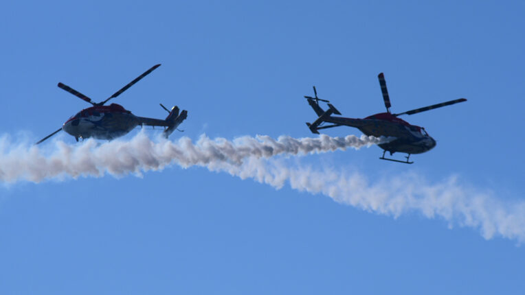 चिलचिलाती धूप में हर कोई आसमान को निहार रहा था कि कब सारंग हैलीकॉप्टर टीम दिखाई देगी. ऐसे में भारतीय वायु सेना के 4 एडवान्स लाइट लाइट हेलीकॉप्टर ने गड़गड़ाहट के साथ उड़ान प्रदर्शन किया. सारंग टीम ने वाइन ग्लास फॉर्मेशन में मंच तक पहुंचने जैसे कुछ लुभावने युद्धाभ्यास किए. फिर बहुत कुरकुरा और सुरुचिपूर्ण भारत और हीरे की संरचनाओं को प्रदर्शित किया. इसके बाद गुरुत्वाकर्षण-विरोधी डॉल्फिन की छलांग थी जो तीन-विमानों के सिंक्रनाइज़ स्टॉल टर्न है. इसके बाद विमान निर्माण ने शानदार हाई-स्पीड क्रॉस को अंजाम दिया. इस बीच दो विमानों ने आसमान में एक सफेद दिल को रंग दिया. एक दूसरे से सिर्फ दो प्रोपेलर की दूरी पर उड़ान भरने वाले हेलिकॉप्टरों ने पायलटों के बेहतर कौशल और विशेषज्ञता को दिखाया.