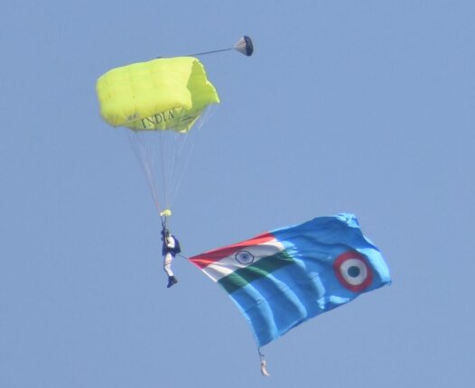वायु सेना की आकाश गंगा टीम के साहसी सदस्यों ने 8,000 फुट की ऊंचाई से नीचे छलांग लगाई. शनिवार को खुले मौसम ने भी इनका अच्छा साथ दिया. एक के बाद एक पैराट्रूपर पैराशूट के साथ निश्चित जगह पर उतरे. इसके बाद टीम के 3 सदस्यों तिरंगा पैराशूट पर एक साथ जमीन पर लैंड किया. विषम परिस्थितियों में भी यह टीम आसमान से छलांग लगाने में माहिर है.