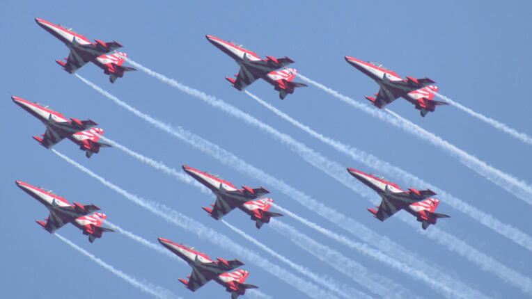 वायु सेना के सभी एयर शो में लोगों को सबसे ज्यादा इंतजार सूर्य किरण एयरोबैटिक टीम का ही होता है. यह टीम एमके हॉक विमान में अपने हैरतअंगेज कारनामों के लिए विश्वभर में जानी जाती है. इससे पहले कि लोग कुछ समझ पाते वायु योद्धाओं के यह दल गड़गड़ाहट के साथ ग्रुप कैप्टन ढिल्लन अपनी टीम के साथ आसमान में दाखिल हुए. फ्लाइट लेफ्टनेंट रिध्दिमा गुरुंग ने पेशेवर रेडियो जॉकी की तरह सूर्य किरण टीम के फार्मेशन की जानकारी दी.