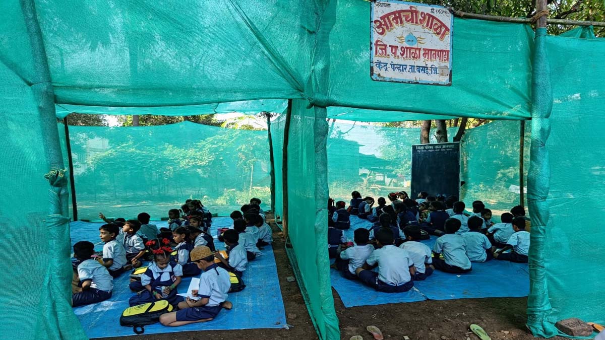 नालासोपारा पूर्व के पेल्हार क्षेत्र स्थित जिला परिषद के मानपाड़ा स्कूल में पेड़ों से लटके बैनर, उनके सामने रखे गए बोर्ड और उसके बीच अवकाश के दौरान गांव में घूमते छात्र नजर आ रहे हैं। जून माह में इस स्कूल का भवन गिर जाने के बाद से इस स्कूल में पढ़ने वाले 110 छात्र पिछले बरसात से ही खुले में पढ़ाई कर रहे हैं।