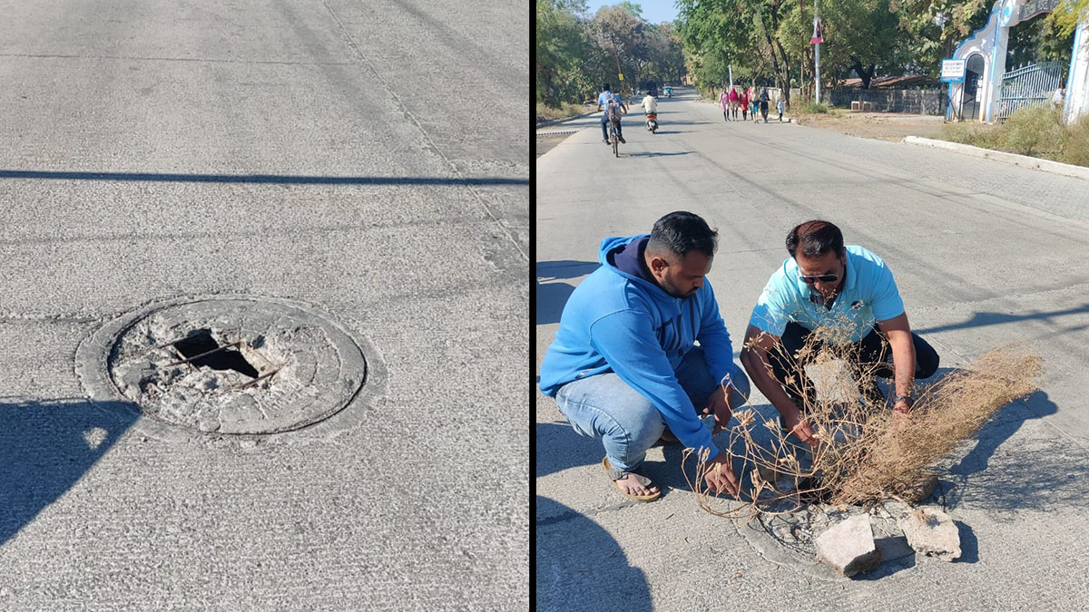 महात्मा गांधी चौक से झांसी रानीचौक तक मार्ग पर हमेशा ही यातायात रहता है़ मार्ग पर जीएस कालेज, जेबी साइंस कालेज के साथ ही पुलफैल व श्मशानभूमि की ओर जानेवाले लोगों की निरंतर भीड़ रहती है़ मंगलवार को ग्रामपंचायत चुनाव की मतगणना तहसील कार्यालय में शुरू रहने से जिलाधिकारी कार्यालय के समक्ष से जानेवाला मार्ग महात्मा गांधी चौक से डा़ आंबेडकर चौक तक यातायात बंद थी़ जिससे यातायात जीएस कालेज मार्ग से ही शुरू थी़ वाहनों के गुजरने से मार्ग पर भूमिगत गटर का चेंबर टूट गया़ यह बात मार्ग से गुजर रहे पूर्व पार्षद परवेज खान के ध्यान में आते ही उन्होंने तुरंत फोटो निकालकर मुख्याधिकारी की ओर शिकायत की़ साथ ही चेंबर के चारों ओर पत्थर रखे, ताकि कोई भी वाहन गड्ढे में गिरकर दुर्घटना का शिकार न हो़ कांग्रेस नेता शेखर शेंडे ने भूमिगत गटर योजना के निकृष्ट दर्जे को लेकर रोष व्यक्त किया.