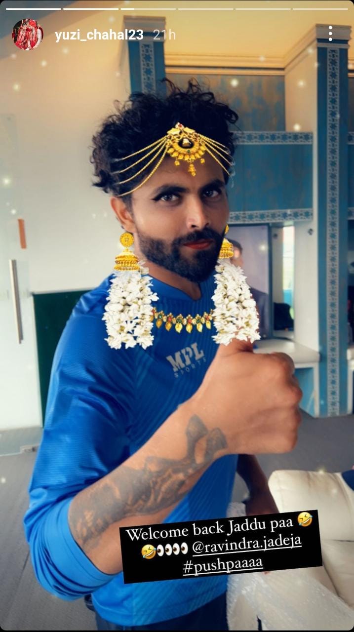 यूजी द्वारा शेयर किये गए तस्वीर में रवींद्र जडेजा को फिल्टर के जरिए ज्वेलरी में देखा जा सकता है। जिसके कैप्शन में युजवेंद्र ने लिखा जड्डू पा का टीम में स्वागत है। साथ ही उन्होंने इसे पुष्पा हैशटेग दिया है।