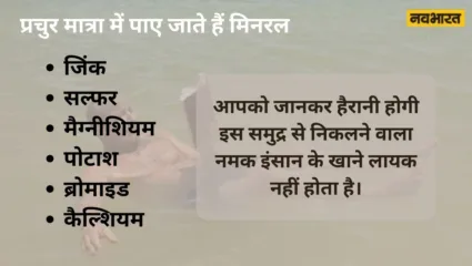 इस समुद्र के अंदर जिंक, सल्फर, मैग्नीशियम, पोटाश, ब्रोमाइड और कैल्शियम जैसे मिनरल प्रचुर मात्रा में पाए जाते हैं। जिसके कारण इस समुद्र का पानी अन्य समुद्रों के मुकाबले बेहद ज्यादा खारा होता है। समुद्र से निकलने वाले नमक को इंसान इस्तेमाल करते हैं लेकिन आपको जानकर हैरानी होगी इस समुद्र से निकलने वाला नमक इंसान के खाने लायक नहीं होता है।