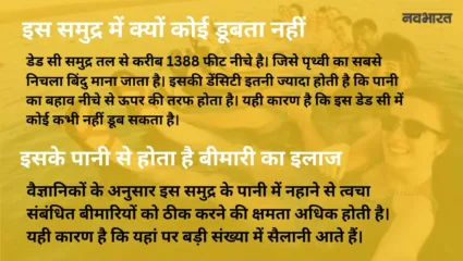 डेड सी में आखिर ऐसी क्या बात है जो इंसान को डूबने नहीं देती है। अगर इंसान इस समुद्र में उतरता है तो उसमें वो नाव की तरह तैरने लगता है। मतलब अगर कोई इस डेड सी में कूद जाए तो वो डूबने की बजाय पानी पर तैरने लगता है। दरअसल इस समुद्र में किसी के भी न डूबने के पीछे की जो वजह है वो बेहद दिलचस्प है, डेड सी समुद्र तल से करीब 1388 फीट नीचे है। जिसे पृथ्वी का सबसे निचला बिंदु माना जाता है। इसकी डेंसिटी इतनी ज्यादा होती है कि पानी का बहाव नीचे से ऊपर की तरफ होता है। यही कारण है कि इस डेड सी में कोई कभी नहीं डूब सकता है।