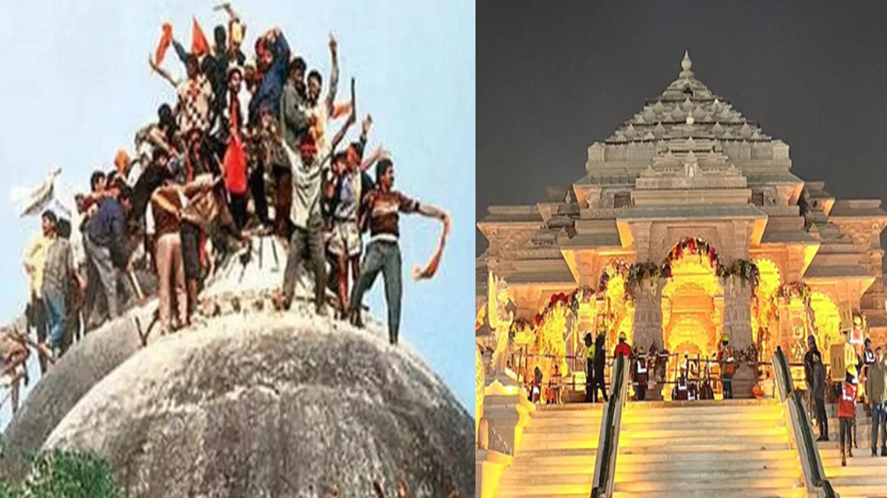 अयोध्या का विवादित ढांचा और नवनिर्मित राम मंदिर।